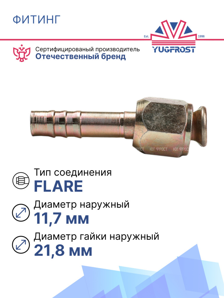 Фитинг Flare 10,5 мм (G8) с гайкой (внутренняя резьба) прямой. Используется в ремонте магистралей хладагента практически во всех типах легковых и грузовых автомобилей. Применяется для автокондиционирования и рефрижераторных установок