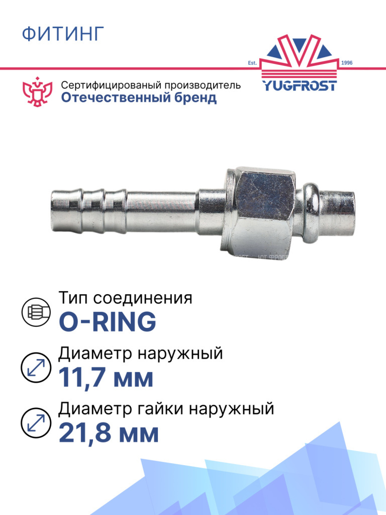 Фитинг O-Ring 10,5 мм (G8) с гайкой (внутренняя резьба) прямой. Используется в ремонте магистралей хладагента практически во всех типах легковых и грузовых автомобилей. Применяется для автокондиционирования и рефрижераторных установок
