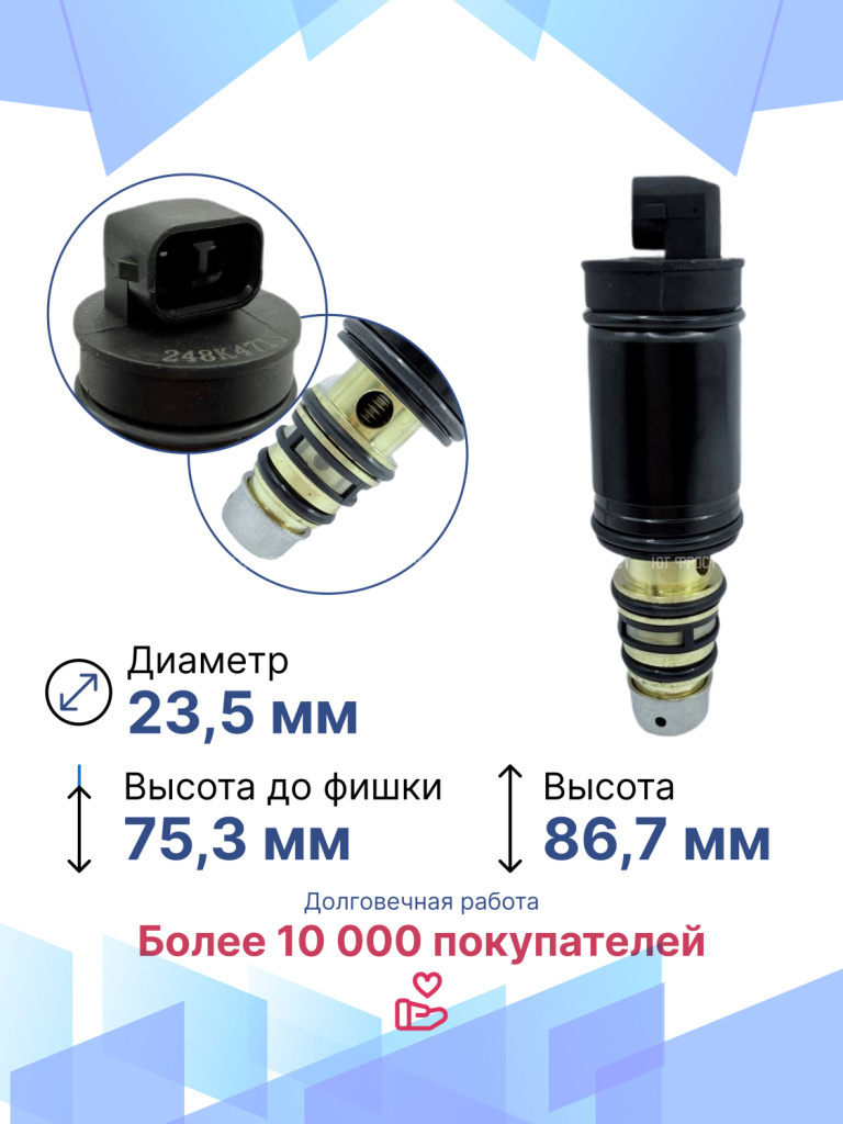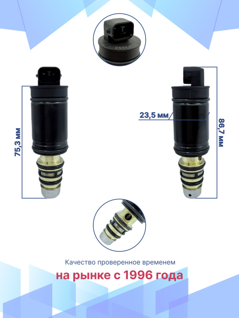 Электромагнитный клапан для Mercedes-Benz, BMW, Audi – важный элемент системы климат-контроля автомобиля, который в большинстве автомобилей современного производства устанавливается вместо электромагнитной муфты. Управляющий клапан кондиционера служит для включения и выключения компрессора. Электромагнитный клапан подходит для различных модификаций Мерседес-Бенц, БМВ, Ауди, гарантируя точную совместимость и надежность. Данная запчасть не имеет OEM номера, поэтому подбирается по образцу или внешнему виду, а также по фото и размерам клапана. Электромагнитный управляющий клапан компрессора автомобиля возврату и обмену не подлежит, т.к. является высокотехнологичным изделием и электрооборудованием, которое в случае установки теряет товарный вид. Перед отправкой мы тестируем каждый клапан, гарантируем его полную работоспособность. Остались вопросы? Свяжитесь с нами!
