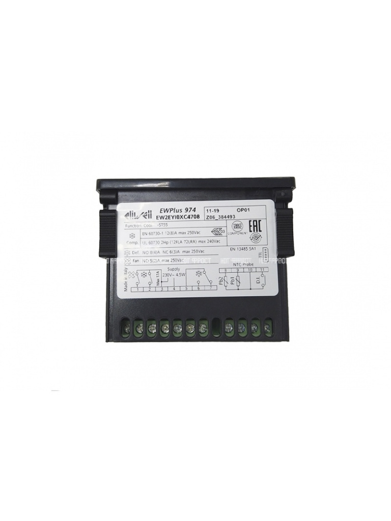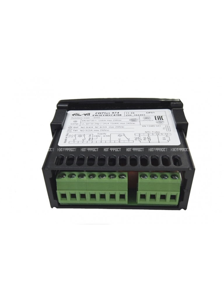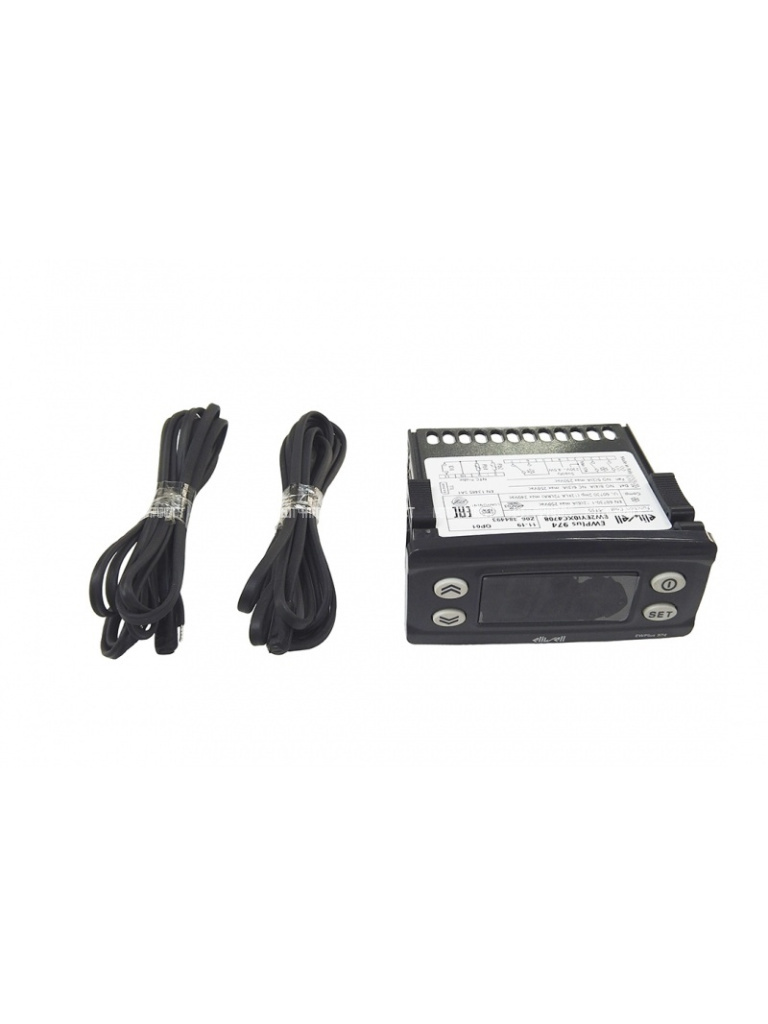 Контроллер Eliwell ID 974 — прибор, предназначенный для вентилируемых холодильных установок средней и низкой температуры (от -45°С до +10°С). Оснащён двумя входами РТС или NTC под термодатчики и тремя выходными реле для контроля компрессора, вентилятора и разморозки. Длительность циклов разморозки может быть, как задана, так и по отсечке установленной температуры испарителя. Считываемое датчиком значение передаётся на 3-х цифровой дисплей. Имеет TTL-порт для карточки копирования.