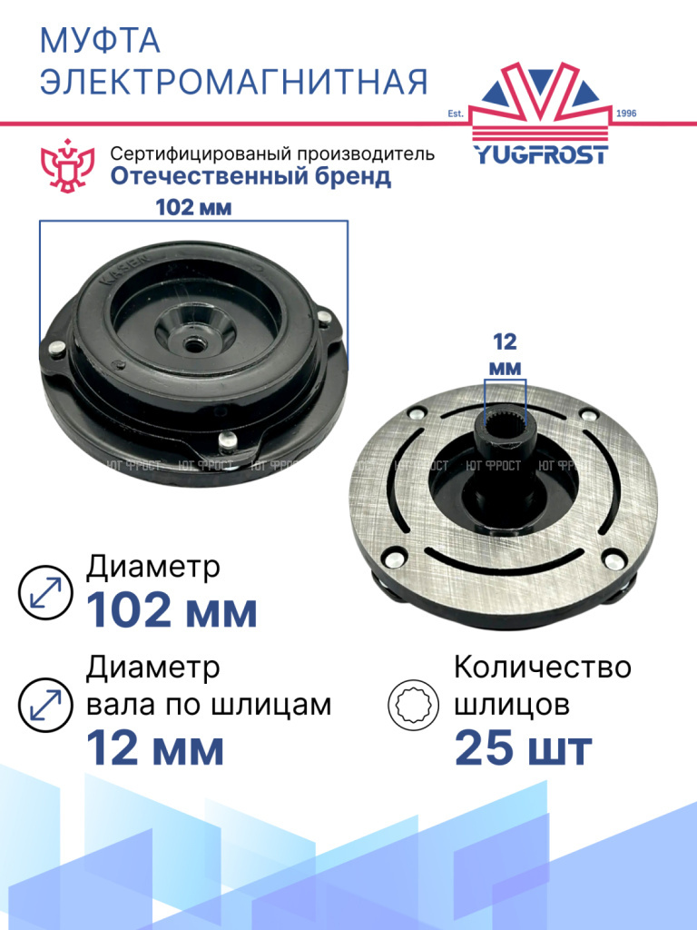 Страна производительТайваньПроизводительYUGFROSTТип ремня приводаПоликлиновой / PV6Напряжение, V12Внешний диаметр подшипника, мм52Внутренний диаметр подшипника, мм35Толщина подшипника, мм20Диаметр муфты, мм115Внешний диаметр катушки, мм96Внутренний диаметр посадочного места катушки, мм40Внешний диаметр прижимной пластины, мм102Диаметр муфты (по ремню), мм101Высота катушки, мм26Высота посадочного места, мм16.8Диаметр вала по шлицам, мм12Количество шлицов25Габариты