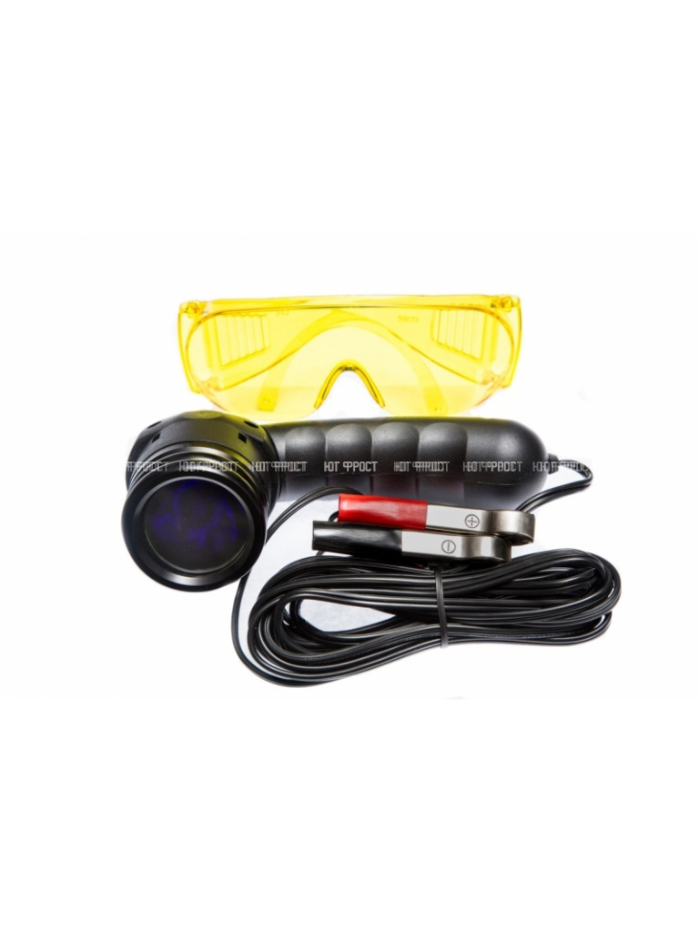 Ультрафиолетовый фонарик с мощным ультрафиолетовым излучением мощностью 50 Вт питанием от бортовой сети автомобиля 12V. На ультрафиолетовом фонарике имеется кнопка периодического включения. Специализированные очки, защищающие глаза от ультрафиолетового спектра. При помощи данного набора можно оперативно определите локальное место утечки хладагента с предварительно введенным в систему ультрафиолетовым индикатором.