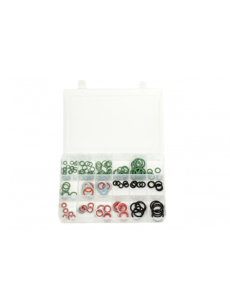 Комплект уплотнительных колец. Уплотнительные кольца для фитингов кондиционера применяются, чтобы исключить возможность утечки фреона в местах соединения магистралей и стыков с агрегатами. В процессе эксплуатации автомобильного кондиционера требуется применять особые фреоностойкие и маслостойкие кольца. При ремонте, системы кондиционера и рефрижератора рекомендуется использовать кольца зарубежных производителей, которые изготавливаются из особых стойких материалов. При ремонте автомобильного кондиционера и рефрижератора,рекомендуется располагать полным комплектом колец различных размеров и диаметров.