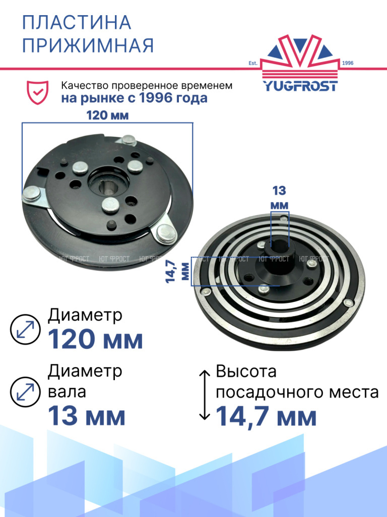 Прижимная пластина – один из наиболее высоконагруженных элементов компрессора автокондиционера. В неактивном состоянии элемент расположен свободно от вращающегося шкива на валу компрессора. При появлении напряжения на электромагнитной муфте происходит смыкание поверхностей – инициируется движение хладагента и охлаждение салона. Зацепление на валу осуществляется с помощью шлицевого или шпилечного соединения, а передача момента – с помощью насечек. Проблемы возникают по причине физического износа детали. Проблемы проявляются в характерном шуме, запахе гари и исправляются,путем замены прижимной пластины.
