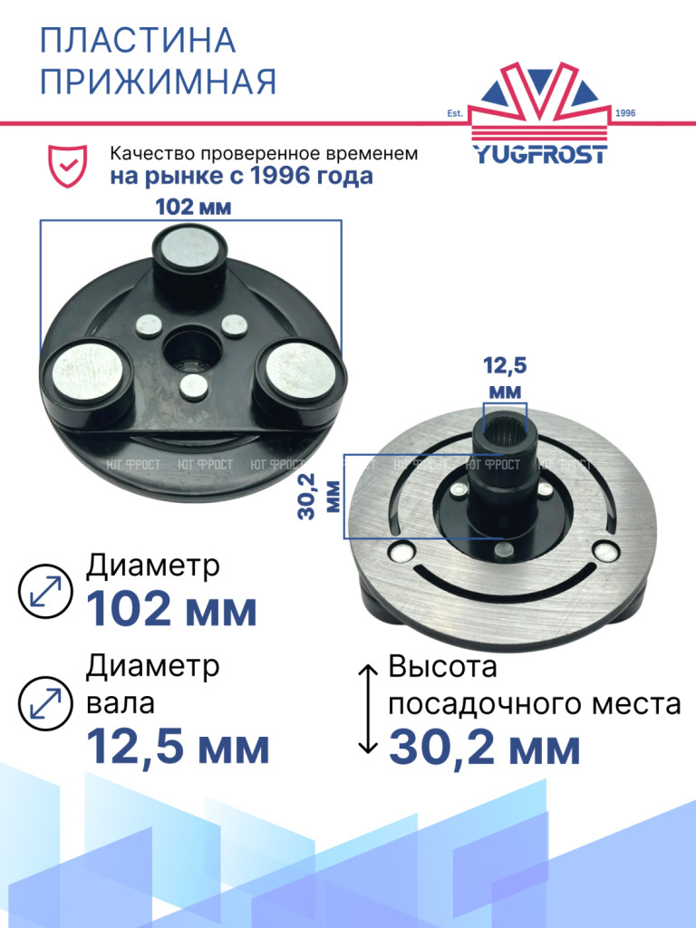 Прижимные пластины, также известные как пластины сцепления, располагаются в механизме электромагнитного сцепления компрессора. Обеспечивают эффективное соединение между шкивом и компрессором при включении сцепления. Признаки поломки проявляются в характерном шуме, запахе гари и исправляются путем замены пластины.