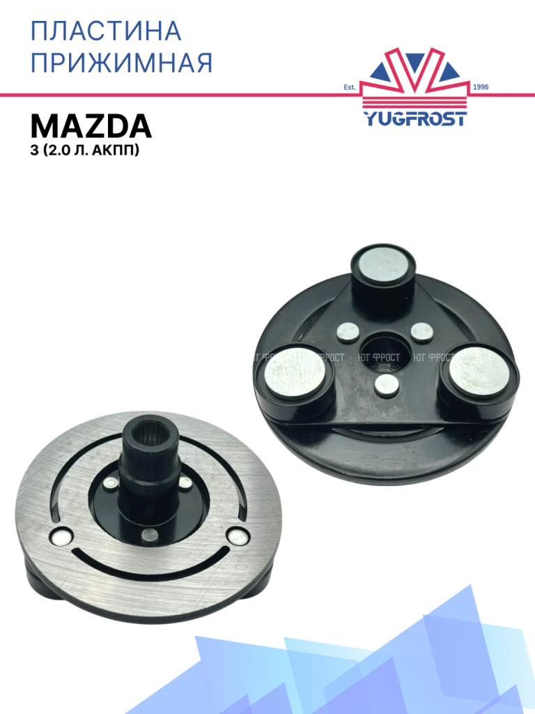 Прижимные пластины подходят для автомобилей Mazda 3. Изготовлены из прочного металла, устойчивого к износу и температурным перепадам. Наши прижимные пластины для Мазда 3 просты в установке, подходят для замены при ремонте или поломке компрессора. Удостовериться, что деталь подходит вашей машине, можно на нашем сайте во вкладке Применимость. Остались вопросы? Свяжитесь с нами!