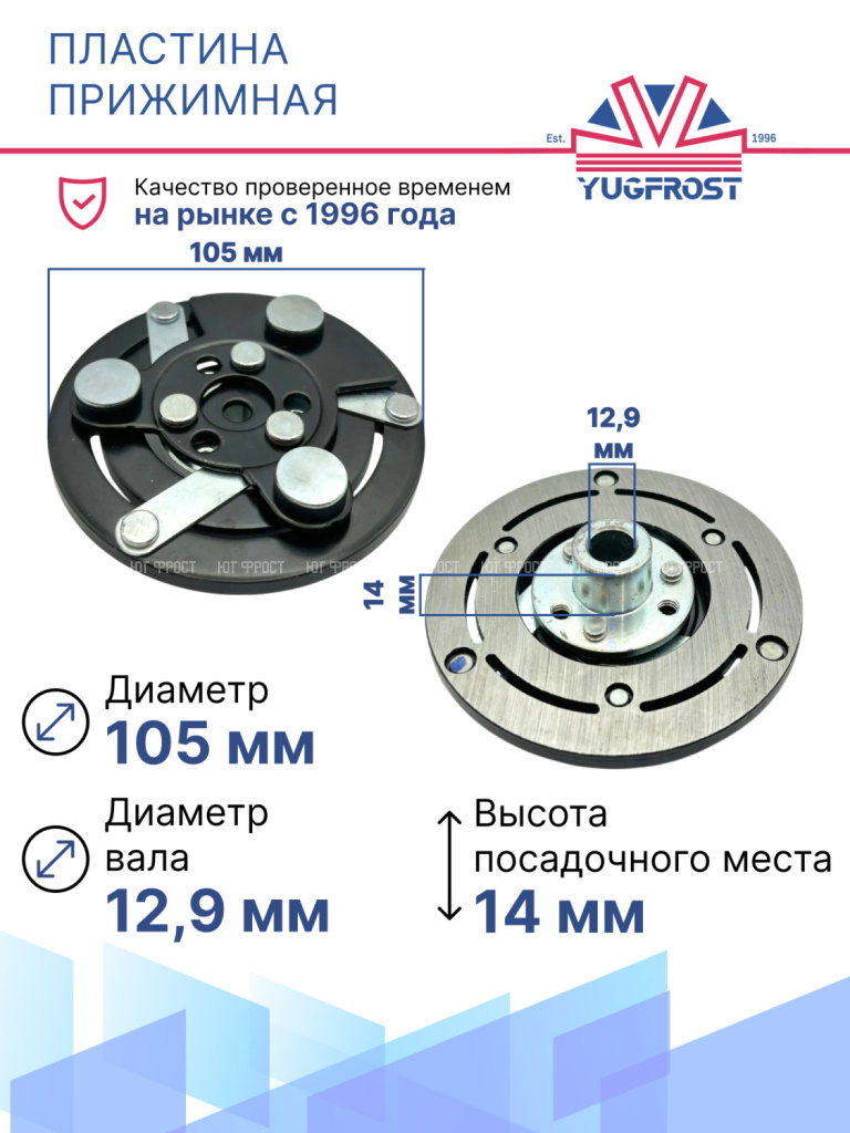 Прижимные пластины, также известные как пластины сцепления, располагаются в механизме электромагнитного сцепления компрессора. Обеспечивают эффективное соединение между шкивом и компрессором при включении сцепления. Признаки поломки проявляются в характерном шуме, запахе гари и исправляются путем замены пластины.