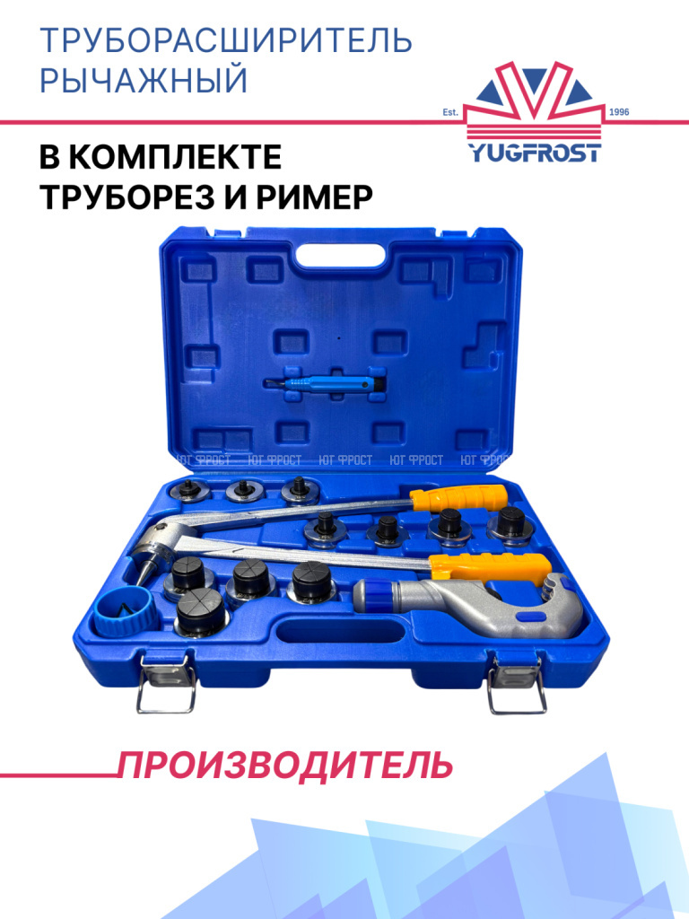 Труборасширитель рычажный со сменными расширительными насадками в кейсе. Предназначен для изготовления раструба на трубе, что позволяет соединять трубы при помощи пайки враструб, без использования соединительных муфт. Диаметр труб с которыми может работать труборасширитель: от 3/8" до 7/8".В комплект поставки входит: труборасширитель, сменные насадки, труборез, ример, пластиковый кейс, инструкция.
