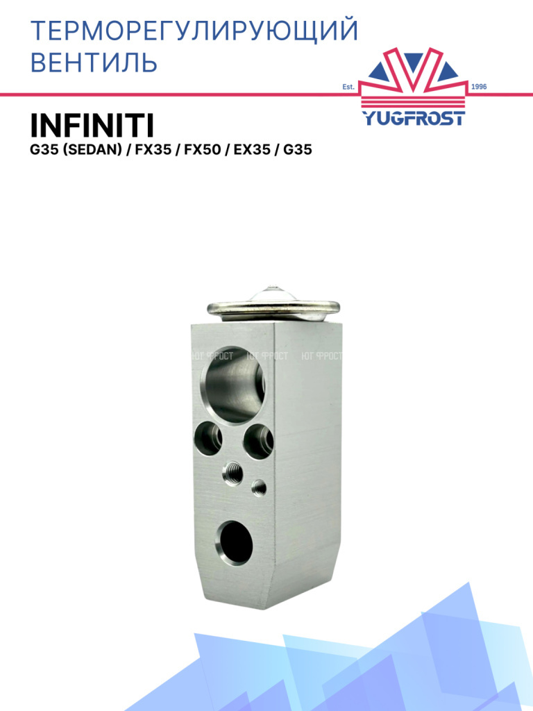 ТРВ (терморегулирующий вентиль) для кондиционера Infiniti G35 / Infiniti FX35 / Infiniti FX50 / Infiniti EX35 / Infiniti G35 – важный элемент системы охлаждения, обеспечивающий регулировку потока хладагента. Клапан ТРВ регулирует подачу хладагента в испаритель, поддерживая нужную температуру и эффективность охлаждения. Часто полная неработоспособность кондиционера может быть вызвана неисправностью терморегулирующего вентиля.