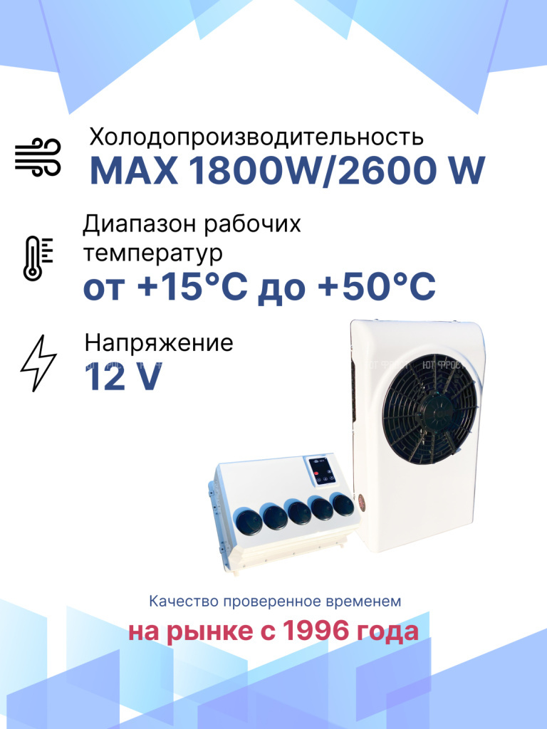 Мощность до 3 кВт. Прекрасное решение для охлаждения салона грузового транспорта или спецтехники. В комплект кондиционера входит набор метизов, наружный и внутренний блоки. Монтаж оборудование можно произвести самостоятельно, останется только заправить систему фреоном в сервисном центре.