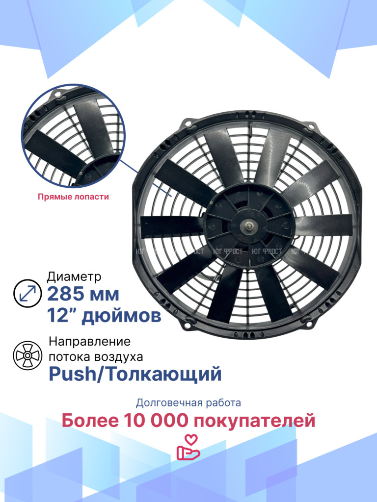Универсальные вентиляторы имеют 4 основных размера (9”, 10”, 12”, 14”), 2 вида вольтажа (12В и 24В) и различную мощность (от 80Вт до 180Вт).