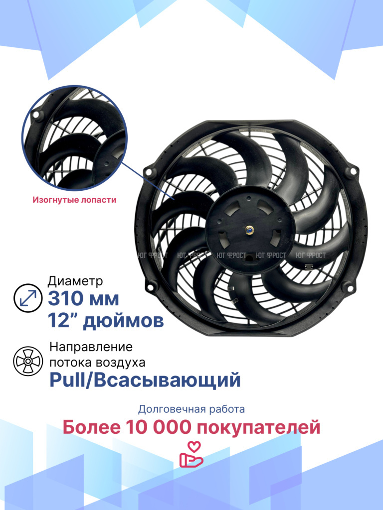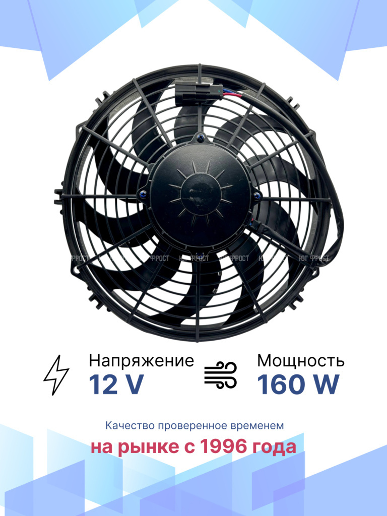 Универсальные вентиляторы имеют 4 основных размера (9”, 10”, 12”, 14”), 2 вида вольтажа (12В и 24В) и различную мощность (от 80Вт до 180Вт).