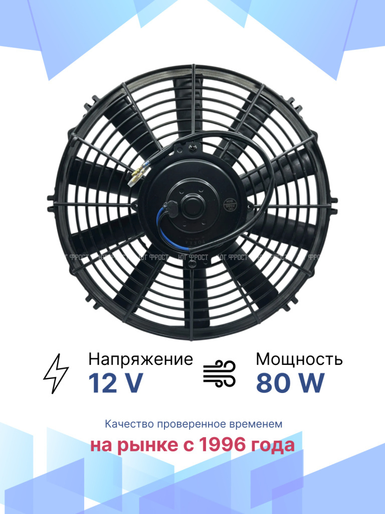 Универсальные вентиляторы имеют 4 основных размера (9”, 10”, 12”, 14”), 2 вида вольтажа (12В и 24В) и различную мощность (от 80Вт до 180Вт).