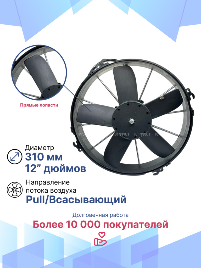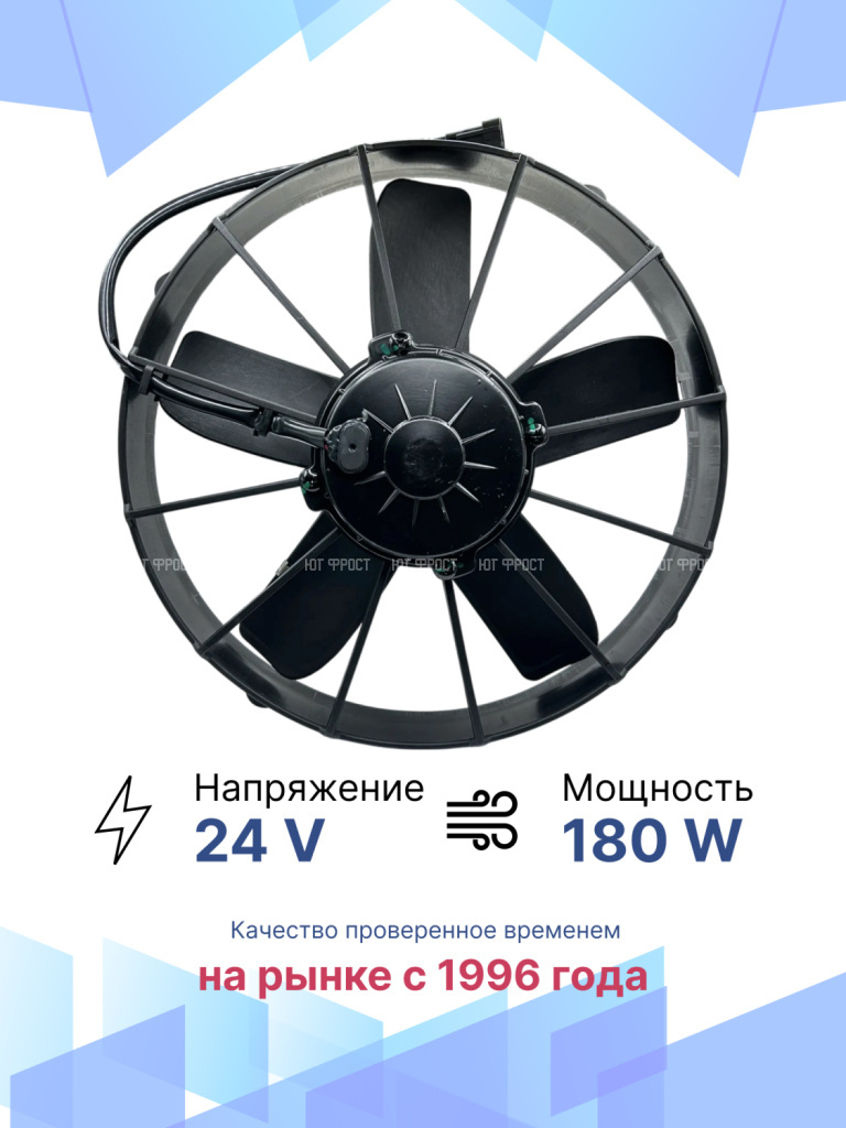 Универсальные вентиляторы имеют 4 основных размера (9”, 10”, 12”, 14”), 2 вида вольтажа (12В и 24В) и различную мощность (от 80Вт до 180Вт).
