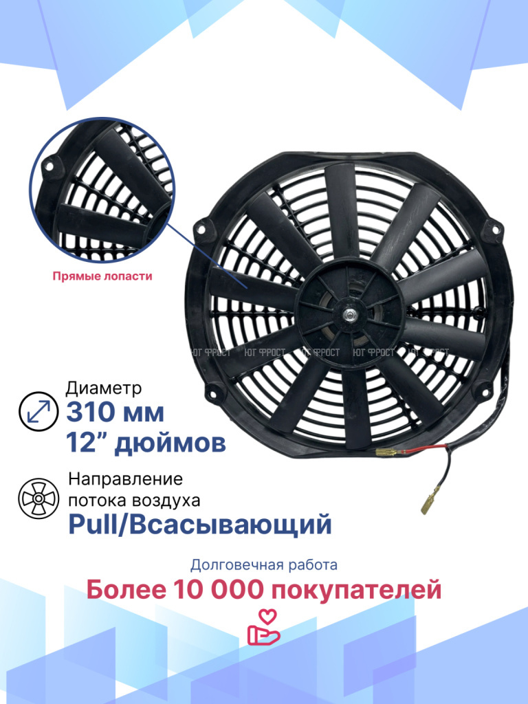 Универсальные вентиляторы имеют 4 основных размера (9”, 10”, 12”, 14”), 2 вида вольтажа (12В и 24В) и различную мощность (от 80Вт до 180Вт).