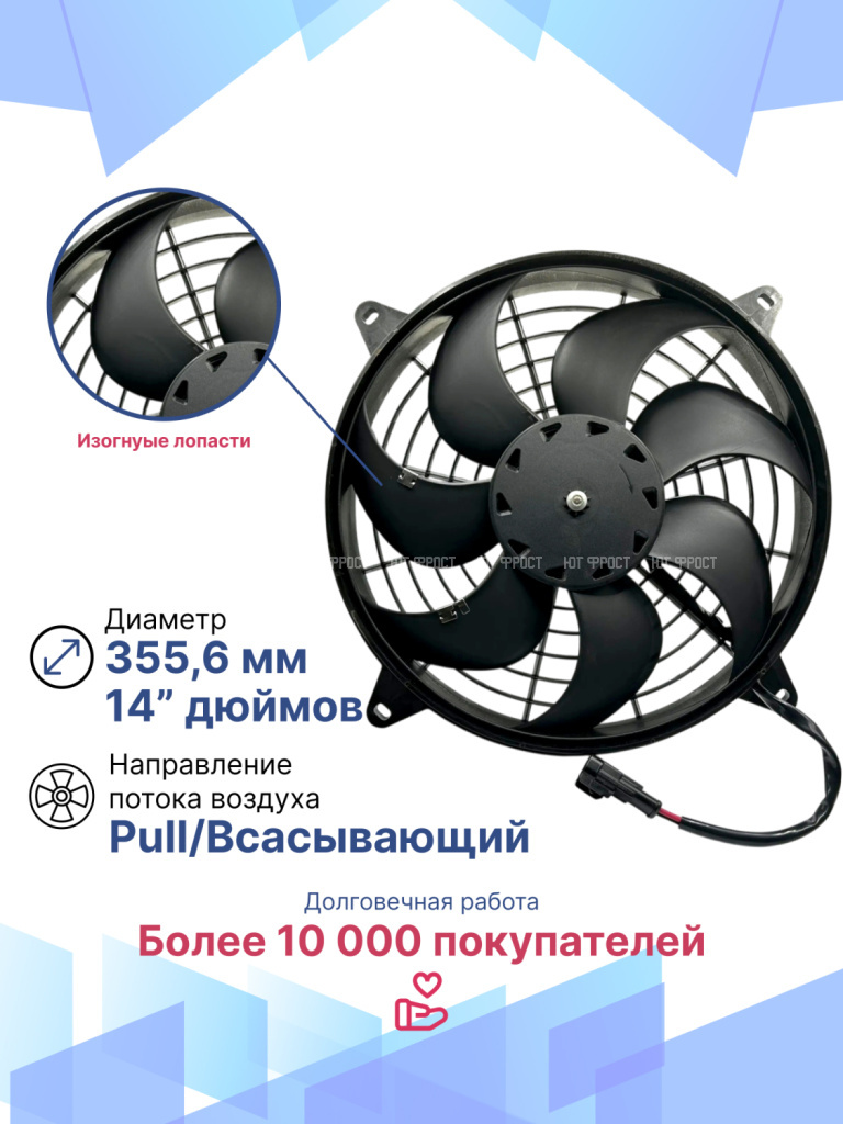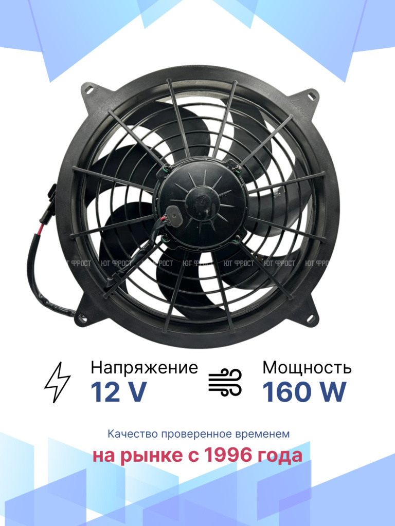 Универсальные вентиляторы имеют 4 основных размера (9”, 10”, 12”, 14”), 2 вида вольтажа (12В и 24В) и различную мощность (от 80Вт до 180Вт).